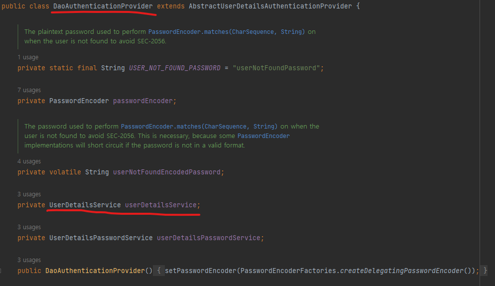 따라서 DB 조회를 통해 로그인을 시도한 사용자가 회원인지를 확인해야 한다. 이 과정은 DAOAuthenticationProvider에서 일어난다. DAOAuthenticationProvider은 UserDetailsService를 통해 접근한 사용자를 DB에서 검색하여 대조하고 인증을 진행한다.