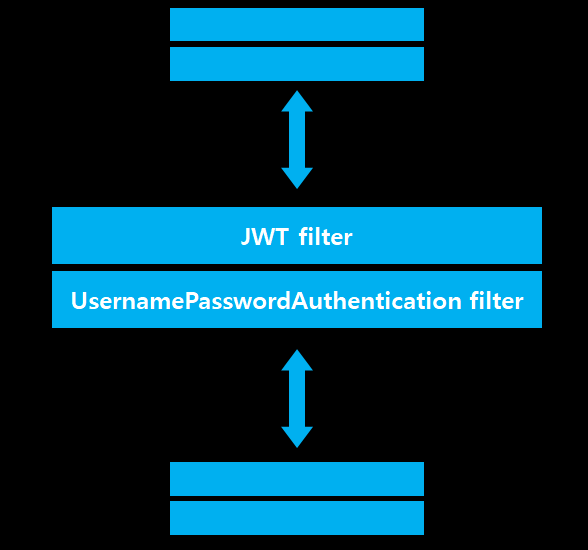 Spring Security 필터 중 Authentication과 관련된 필터는 일부이고, 그 중 가장 먼저 등장하는 것이 UsernamePasswordAuthentication filter이다. 그 앞에 JWT 필터를 끼워넣었다.