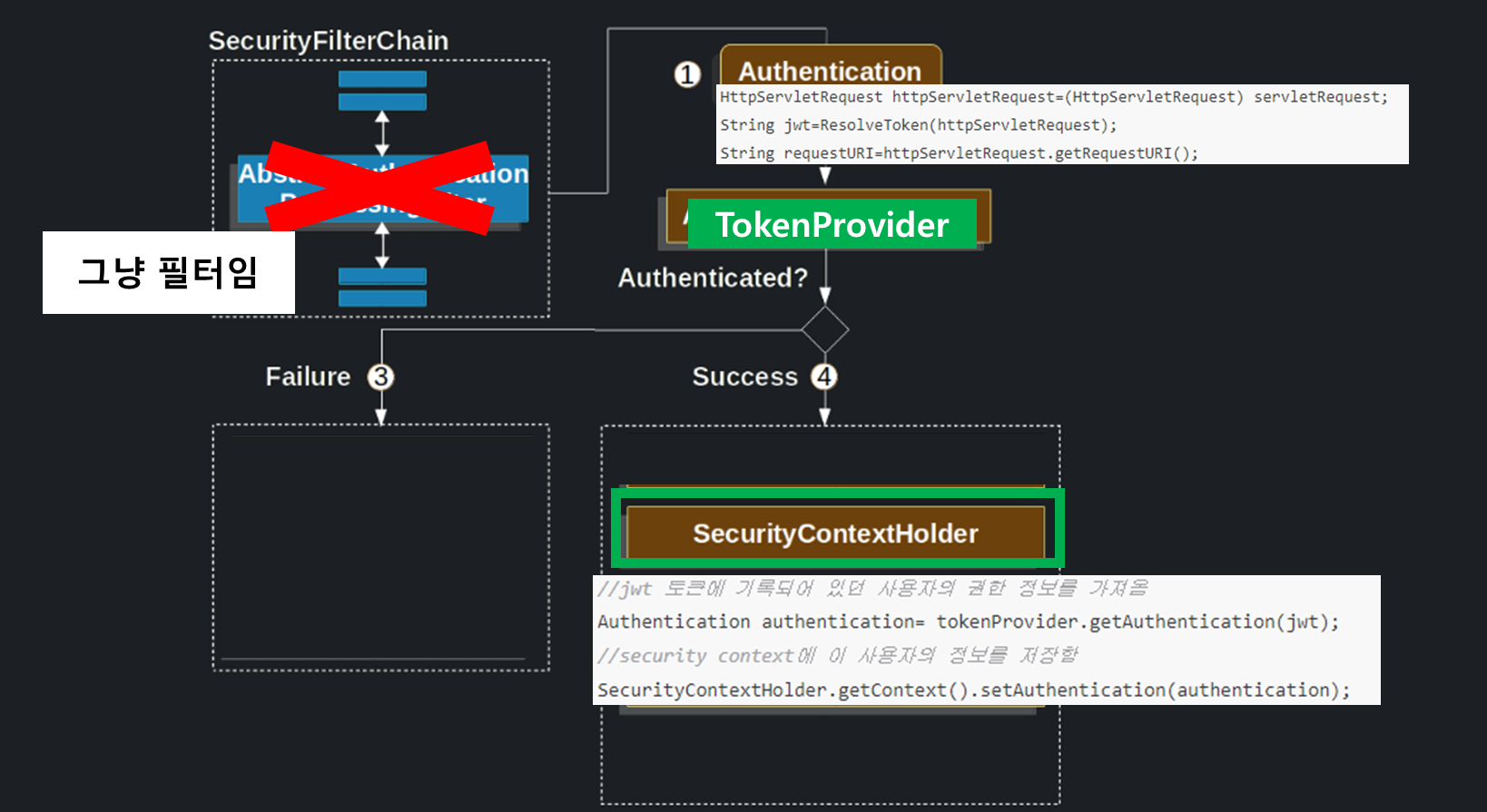 이 경우는 1편과 달리 구현할 것이 많다. Filter는 물론, AuthenticationProvider와 AccessDeniedHandler, Entrypoint까지 직접 구현해야 한다.
